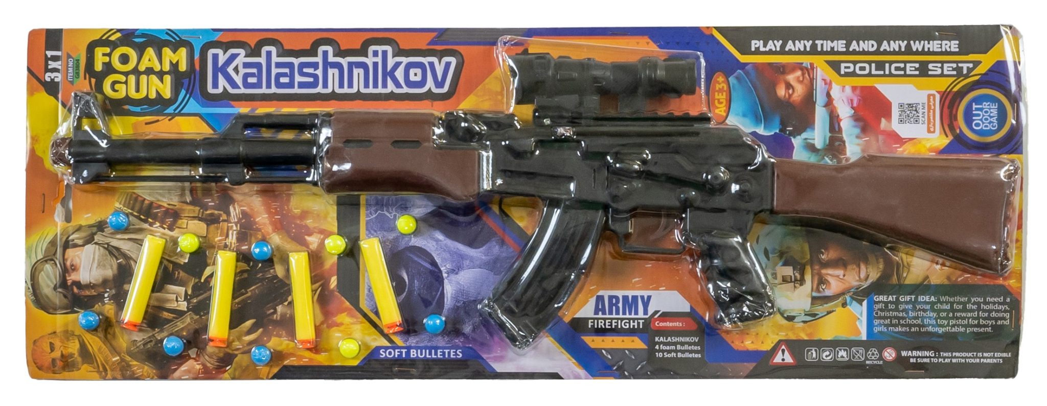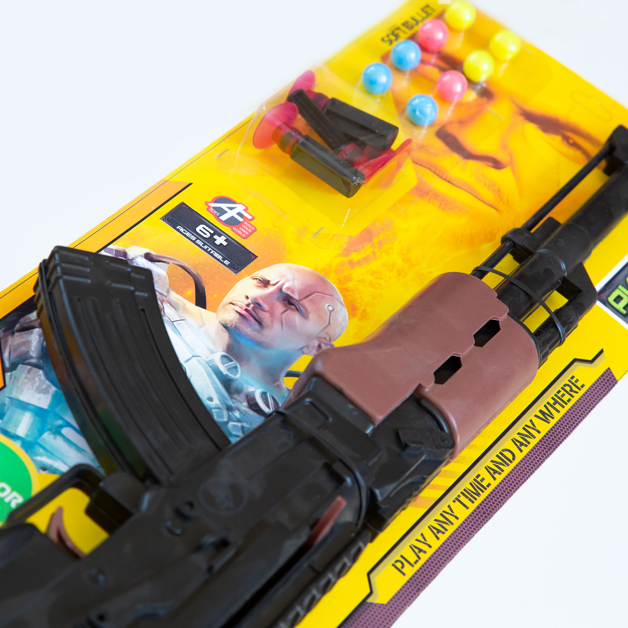 - بستهبندی کارتی با جذابیت بصری بالا: نمایش تفنگ به همراه دو نوع مهمات رنگارنگ بر روی یک کارت بزرگ، جذابیت بصری فوقالعادهای در قفسه ایجاد کرده و توجه مشتری را فوراً به خود جلب میکند.
